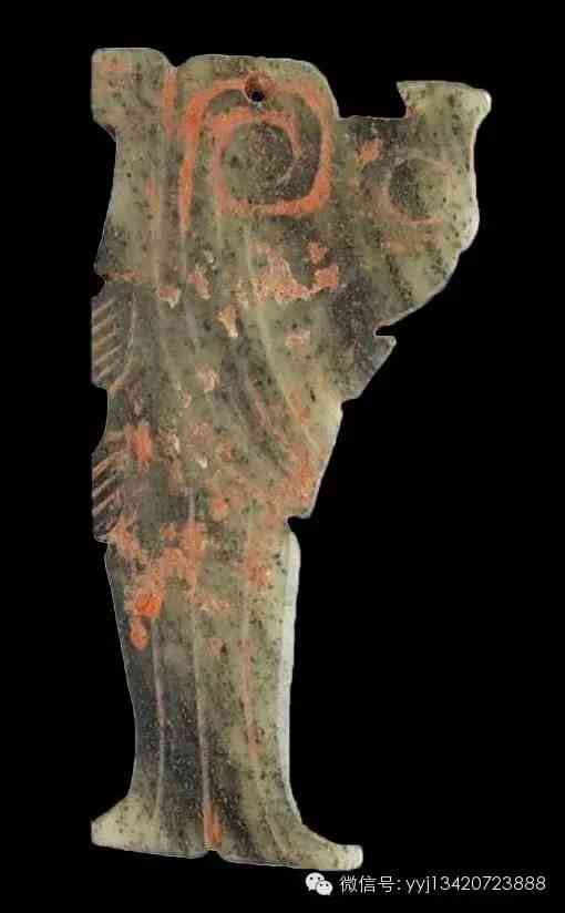 商晚期至西周早期 鳥形玉珮。青黃色玉質(zhì),表面沾有混了硃砂的泥土。雕一側(cè)面的勾喙卷尾鳥形,喙下、胸前、腹下、卷尾等處,各有圓穿,用以佩帶。長5.8公分。