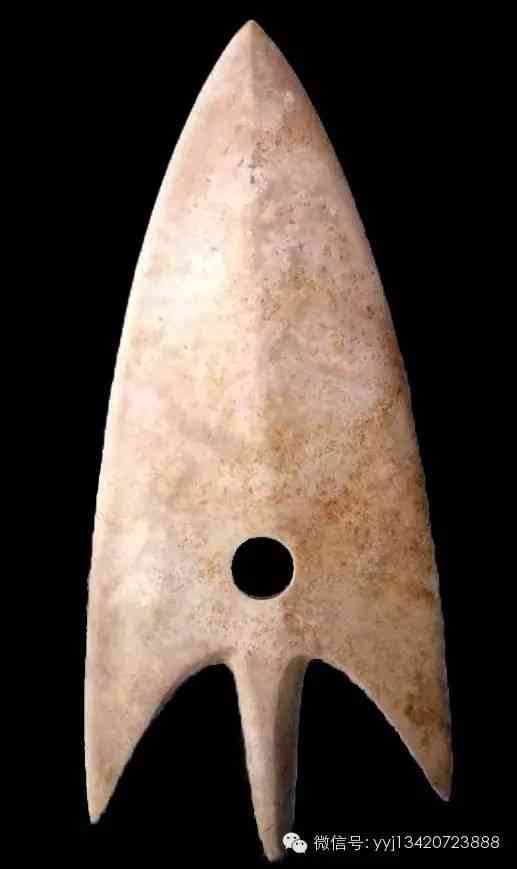 商代 玉鏃。牙黃色玉質(zhì)。中脊明顯,兩側(cè)對稱,有鋌,鏃體與鋌間呈凹弧形,鉆有一孔。鏃形表面及兩側(cè)刃拋磨光滑。深淺交雜不透明的牙黃色玉質(zhì),細膩溫潤。琢作一玉簇。但較一般箭簇寬大。由器之外形、中脊等觀之,似為用玉戈或玉矛改製而成。這種玉料流行于龍山時期至商、西周,而此造形的戈、矛,較接近商代風(fēng)格。改工部質(zhì)地色澤均自然,應(yīng)去原作時期不遠,固亦訂為商代。長10公分 寬4.5公分 厚0.6公分。