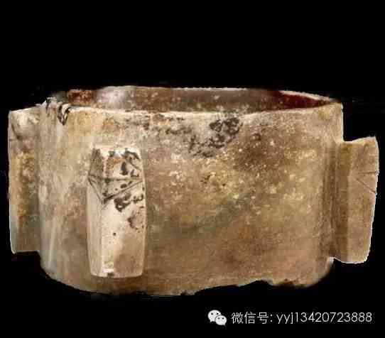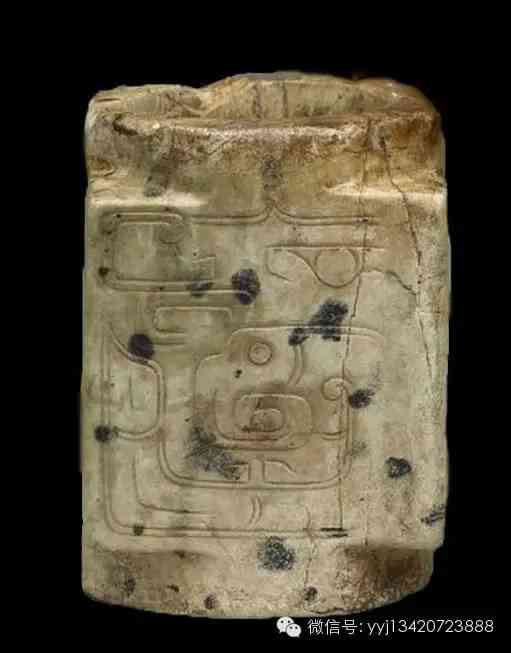 西周 鳳紋玉石棕?;野讑A淺綠色玉石質(zhì),散布黑斑局部已變?yōu)闇\褐色。雕一外方內(nèi)圓,上下有射口的棕,外壁琢鳳紋與抽象的龍紋與虎面紋。寬6公分 高8.5公分。