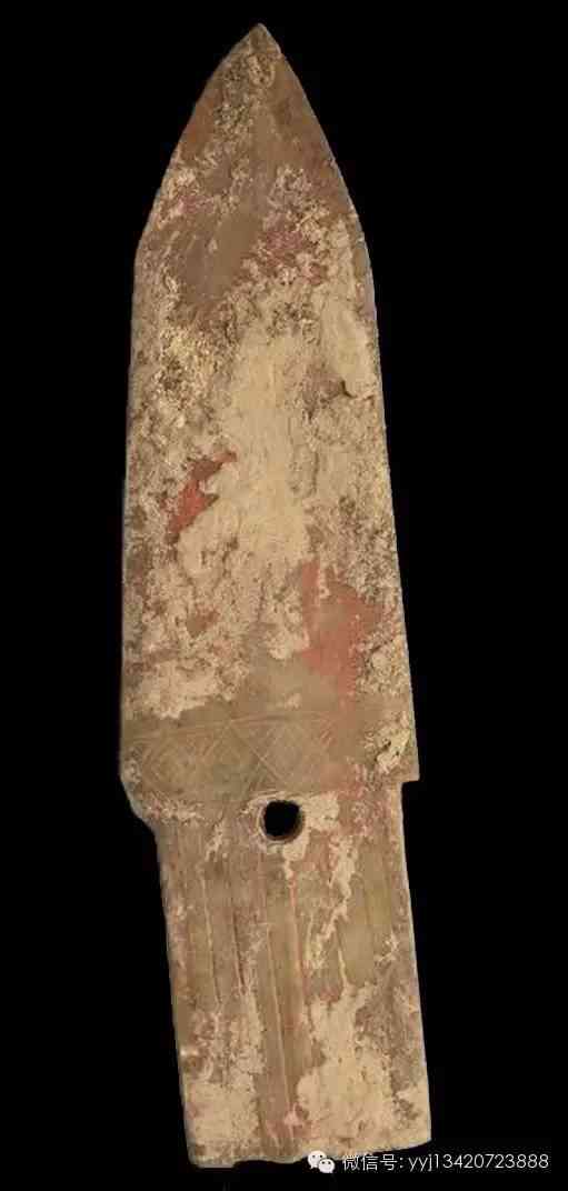 西周 小玉戈 。墨灰半透明玉,有黑色芝麻點,沾有硃砂。援末端較窄,中間有稜脊,前鋒尖銳帶彎,雙面刃,內(nèi)作梯形,援與內(nèi)交接處鉆有一孔。9.4公分x1.4公分x0.4公分