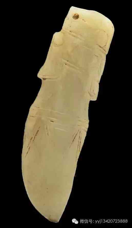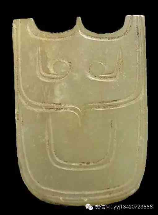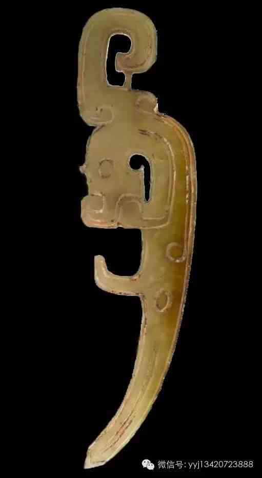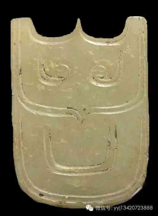 商 玉弭?;野灼S色玉。弭,是射箭時有關(guān)的器物,嵌在弓的兩端,作掛弦之用。此玉弭中段飾以三角形紋,頂部刻簡化側(cè)身獸面紋,大眼睛清楚可辨。6.2公分x1.9公分x0.9公分。