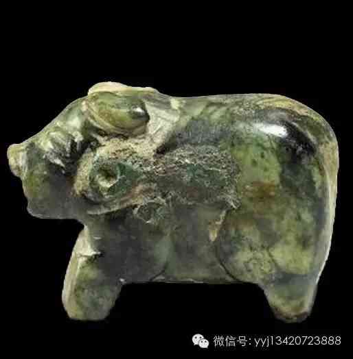 西周 犀牛形玉珮。青玉有綹,局部帶褐色沁斑。以簡鍊的線條勾勒,體軀似牛,但鼻端及兩眼尖各有一翹角,應(yīng)是描繪犀牛。西周的玉雕動物造形多,雕琢手法簡鍊。但如此件以犀牛為母題的玉雕,尚屬稀有的珍品。長4.9公分 高3.3公分 厚0.55公分 。