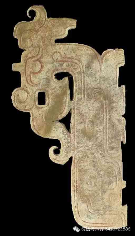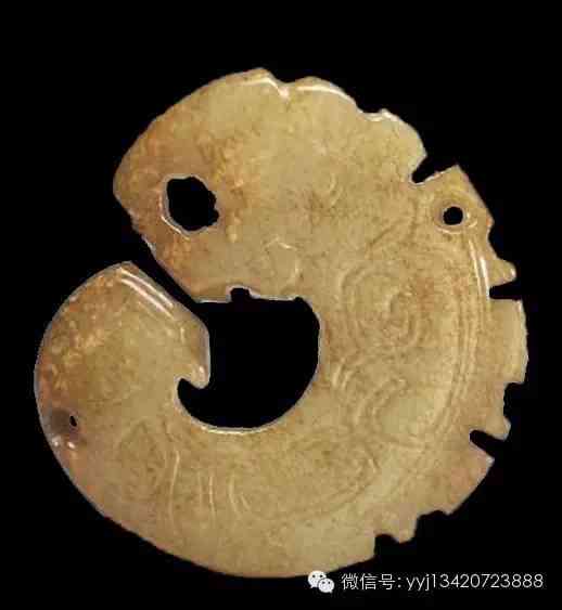 商晚期 小玉龍。器成圓環(huán)帶缺的形式,類似耳飾玦,龍首的部份較寬,但經(jīng)過削磨故略薄,眼睛也因此僅僅殘留些微線條,張口露齒,有角,背脊飾有起伏不規(guī)則的鉏牙,尾部略窄。身軀表面裝飾雙鉤陰刻的彎轉(zhuǎn)線條。鉏牙及近尾端處各有一穿。高3.8公分 寬3.65公分 厚0.7公分。