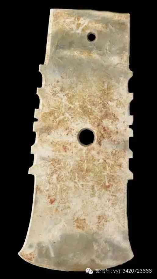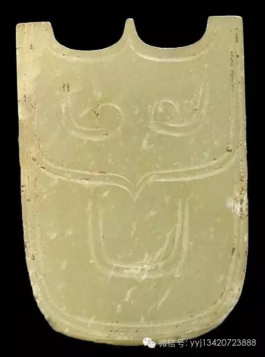 商代 玉戚。斧或鉞的兩側(cè)有刻飾的叫做「戚」,禮器。全器黃色玉質(zhì),局部帶有綠色及褐色斑,質(zhì)地溫潤。器身作略不對稱梯形,近背端鉆有一孔,平背,平刃,兩側(cè)各刻飾五個牙飾。長(中軸)13.0公分 寬8.5公分 厚0.6公分。