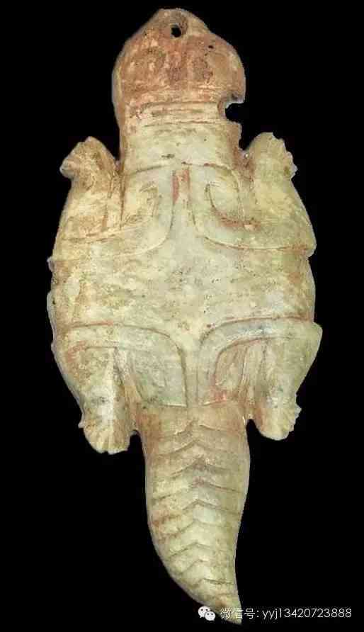 商后期至西周前期 玉蠑螈。不勻的青灰色玉,沾有硃砂。雕一蠑螈,頭部略呈「V」形,鼻間處有一單面鉆鑿的小圓穿,可繫帶。浮雕長方形眼,頸部兩道直線弦紋線,頸側(cè)有一約三分之二圓穿,不詳其原因。腹部光平,背部微拱起,浮雕卷曲內(nèi)縮的四肢,前后肢內(nèi)縮,貼于身側(cè)。尾甚肥大,雕節(jié)紋。長9.7公分 最寬4.2公分。