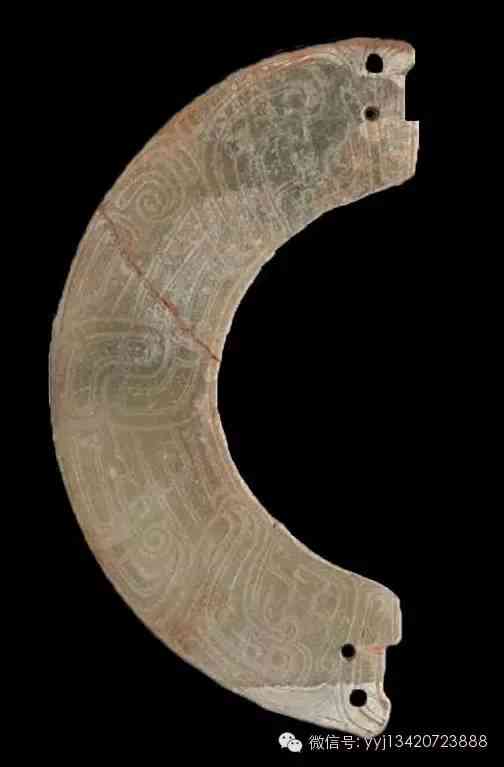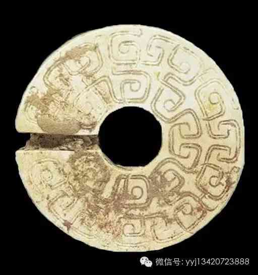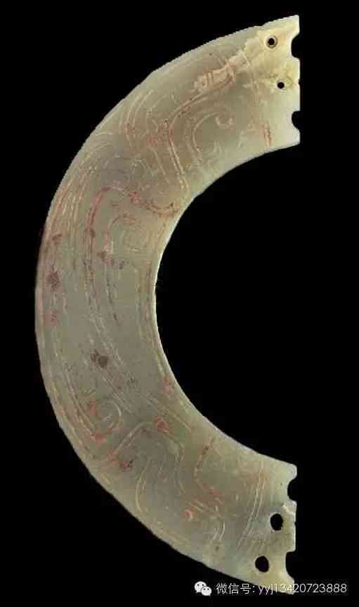 西周晚期至春秋早期 耳飾玦。青綠玉,表面沁成白色,背面微露原來的質(zhì)感,有附著物。全器單面以雙凹線琢幾何變形紋。玦為一種耳飾。