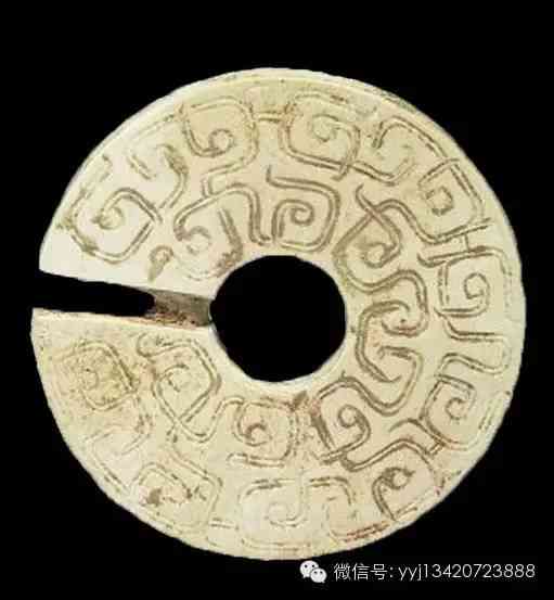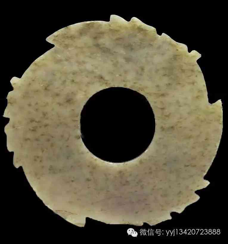 西周 牙璧。青黃玉,局部泛赭色。牙璧是圓璧的變體,在其外緣有等距之「牙」,牙與牙之間的器緣,又加飾成組的小「齒」。此器共有三牙,每組齒為六小凸齒。器形不甚規(guī)整,中孔不圓,厚薄不勻,并留有一直條切割痕。兩面紋同,為等距離的同向圓弧勾紋。外徑最大9.8公分 孔徑5.1-5.3公分。
