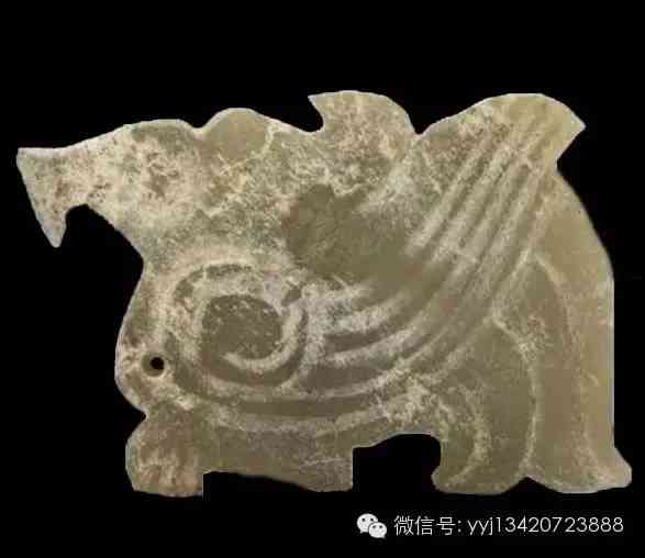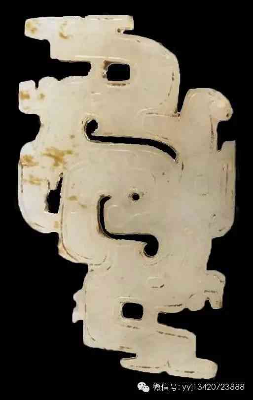 商舊玉鳳(雞骨白) 。舊玉,玉質(zhì)已受沁呈白灰不透明色澤,如雞骨白色,并夾雜灰斑。全器做片狀鳥形,羽冠、鳥嘴、與爪皆為勾狀,一面有陰刻線以示羽翅,另一面則光滑無紋。眼部做一圓形鏤空。3.8×3.4x