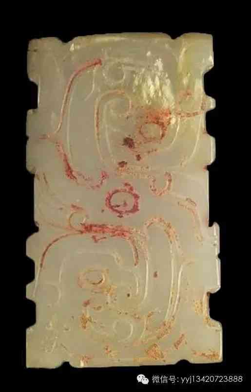 西周 長方形玉飾。青玉,表面沾有硃砂。略成梯形,四周有凹凸齒棱,單面凹雕竊曲紋。背面無紋飾,有二對象鼻穿。長4公分 寬2.47公分 厚0.36公分 。