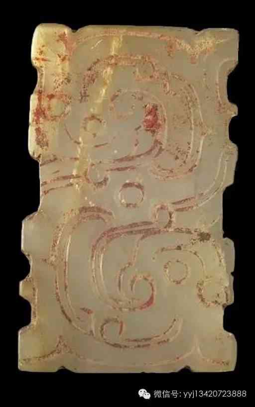 西周 梯形玉飾。青黃色玉,局部白化,器表沾有硃砂。器呈梯形厚片,背面光素,正面以雙陰線雕左右對稱紋飾:「S」形寬帶,一端雕龍頭,另端雕由鳥蛻變之側(cè)面人頭紋。上下兩側(cè)邊各有一排小孔,小孔的它端通向光素背面。這是西周中晚期流行的「玉牌連珠串飾組玉佩」上端的梯形玉飾。9公分x7.7公分x0.9公分 。