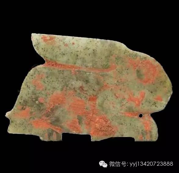 西周早中期 兔形佩。半透明淡綠色玉,有芝麻斑,表面有橘色附著物。雕作一兔,外輪廓形多方直,大眼睛,長耳貼背。線條簡單。