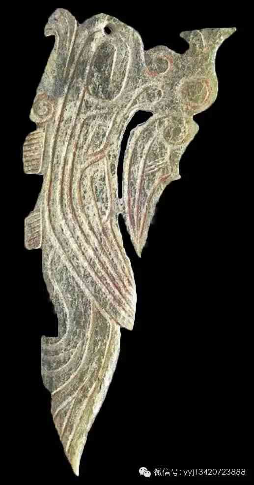 西周 鳳紋柄形器 ?;野子褓|(zhì),沾有硃砂。器作近梯形的片狀柄形器,厚薄不勻。窄端兩面削薄,可用以插嵌于它物之上。器之二面均琢長尾鳳鳥紋,器之外緣,雕齒稜,有兩處齒稜尖端已斷缺。長9.4公分 最寬3.6公分 最厚0.55公分。
