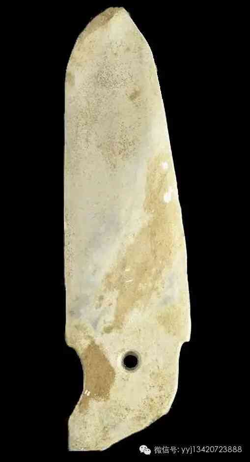 西周 白化玉戈。質(zhì)已深沁為不透明的牙黃色,黏附少量褐色物質(zhì)。琢一小戈,援部與內(nèi)部略呈直條形,僅以小凹陷分隔,無中脊,有邊線。內(nèi)上鉆一小穿。平素?zé)o紋。最寬1.4公分 長11.67公分 最厚0.32公分。