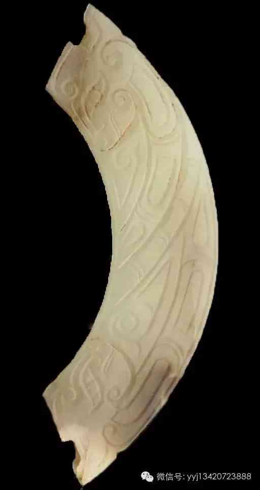 西周早中期 龍紋璜 。青黃玉,有半透明感。圓弧片狀,兩面紋同。雕一對相對的龍紋,體軀抽象化為條帶狀、三角狀。為典型西周玉璜。長10.2公分 肉寬2.2公分。