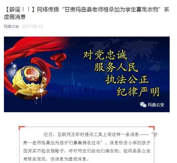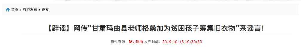 日前,中共瑪曲縣委宣傳部公眾號(hào)魅力瑪曲發(fā)文稱:網(wǎng)傳“甘肅瑪曲縣老師格桑加為貧困孩子籌集舊衣物”系謠言!