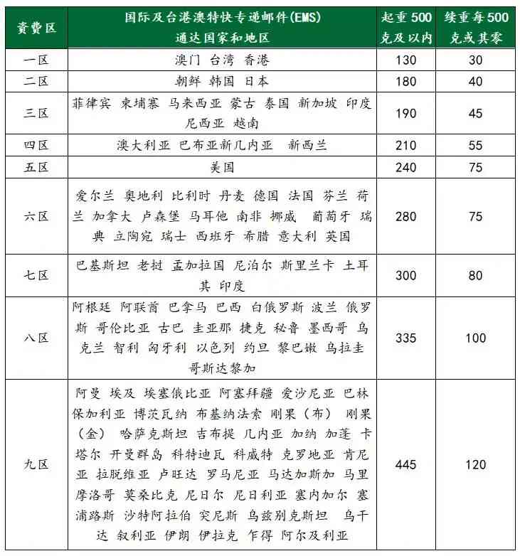 答:個(gè)人寄遞國際及港澳臺(tái)EMS業(yè)務(wù),參照以下價(jià)格表收費(fèi):