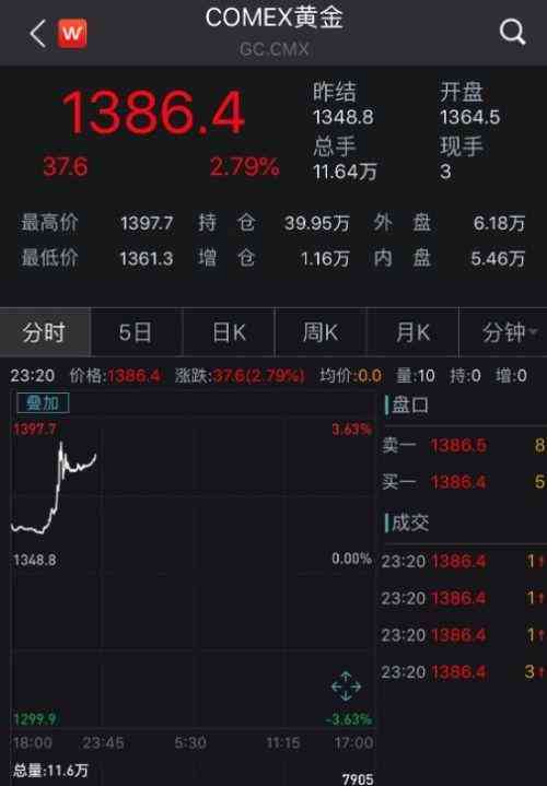 同時(shí),黃金期貨也表現(xiàn)活躍。COMEX黃金期貨一度上漲至1397.7美元/盎司,創(chuàng)5年新高。截至發(fā)稿,COMEX黃金漲幅2.79%,報(bào)1386.4美元/盎司。