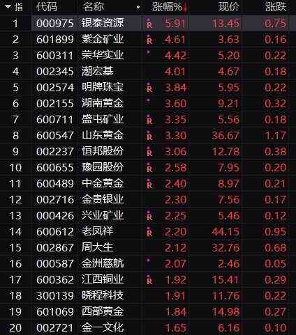 還有,紫金礦業(yè)、潮宏基、明牌珠寶、山東黃金、湖南黃金、中金黃金等多只個(gè)股均有明顯拉升。