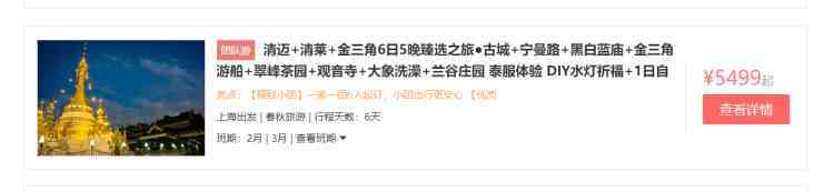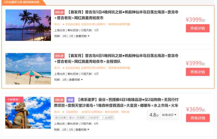 春秋旅游平臺上,泰國出境團隊游產(chǎn)品非常多,熱門目的地有普吉島、曼谷、芭提雅、清邁等,除了單一目的地游玩,還有多種組合。