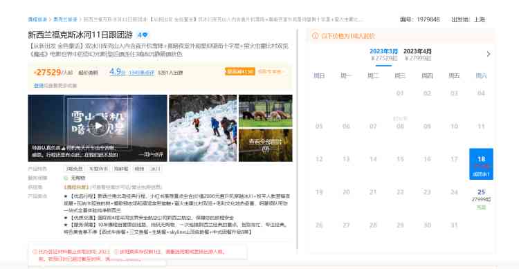 長線游方面,攜程上“新西蘭??怂贡?1日跟團游”銷量很靠前,它的最早一個團是3月18日從上海出發(fā),截止2月7日13:55分,顯示該團已成團,目前僅剩余1個名額。