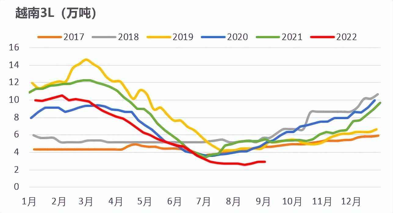 淺色累庫預期少于去年。目前淺色膠庫存接近去年同期,而后市對于全乳膠有一定的減產預期,而3L膠今年由于濃乳分流的原因,從庫存來看同樣累庫速度較慢,因此淺色膠四季度的累庫預期少于去年。