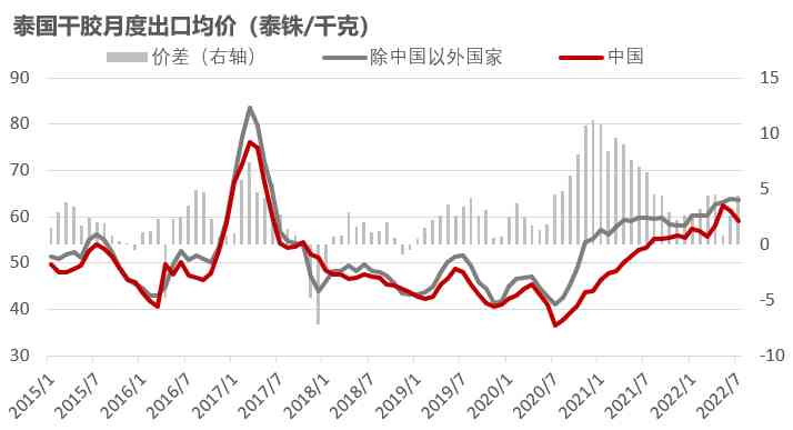 海外標膠需求仍然強勢,海外仍然存在溢價。從泰國海關數據來看,7月出口至海外數量環(huán)比大幅增加,從出口均價來看海外仍然賣出溢價。