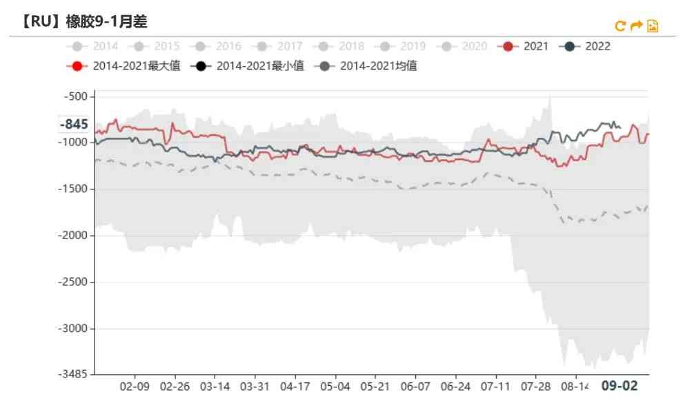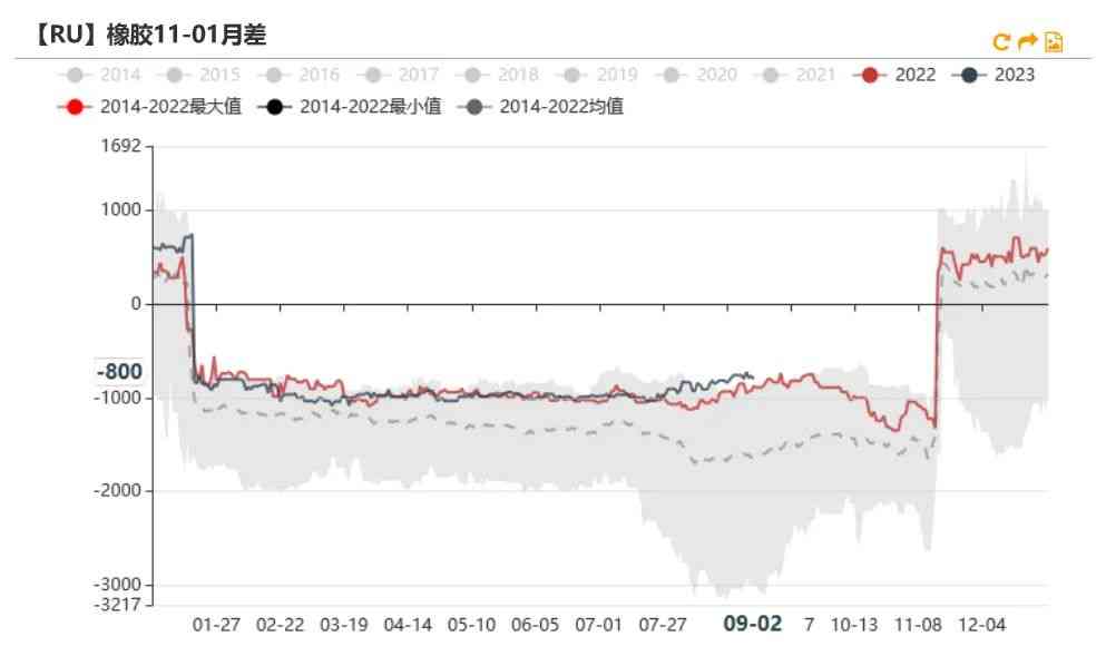 9月2日RU11-01月差為-800元/噸,較上周下跌40元/噸。RU09-01月差為-845元/噸,較上周下跌50元/噸。