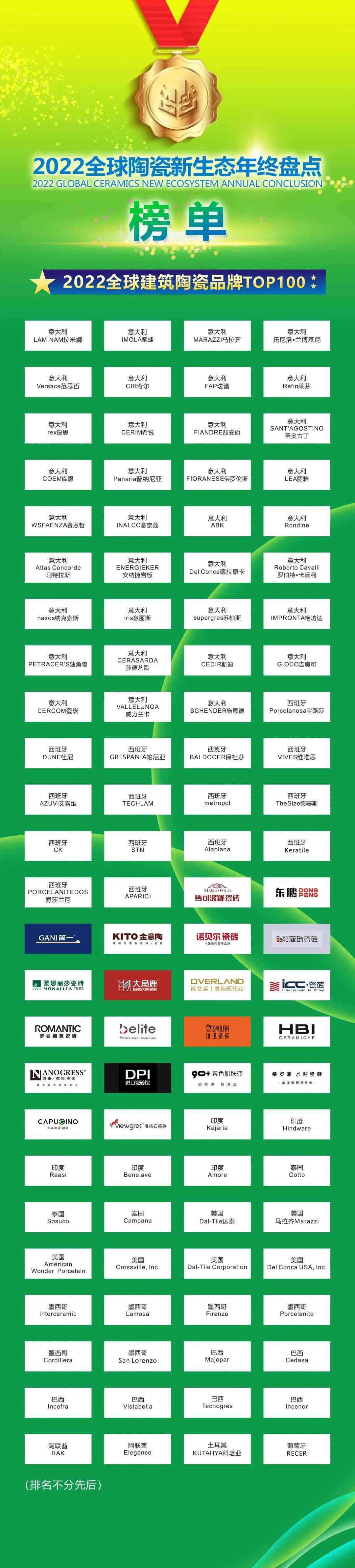 據(jù)悉,“2022全球建筑陶瓷品牌TOP100榜單”具體情況如下: