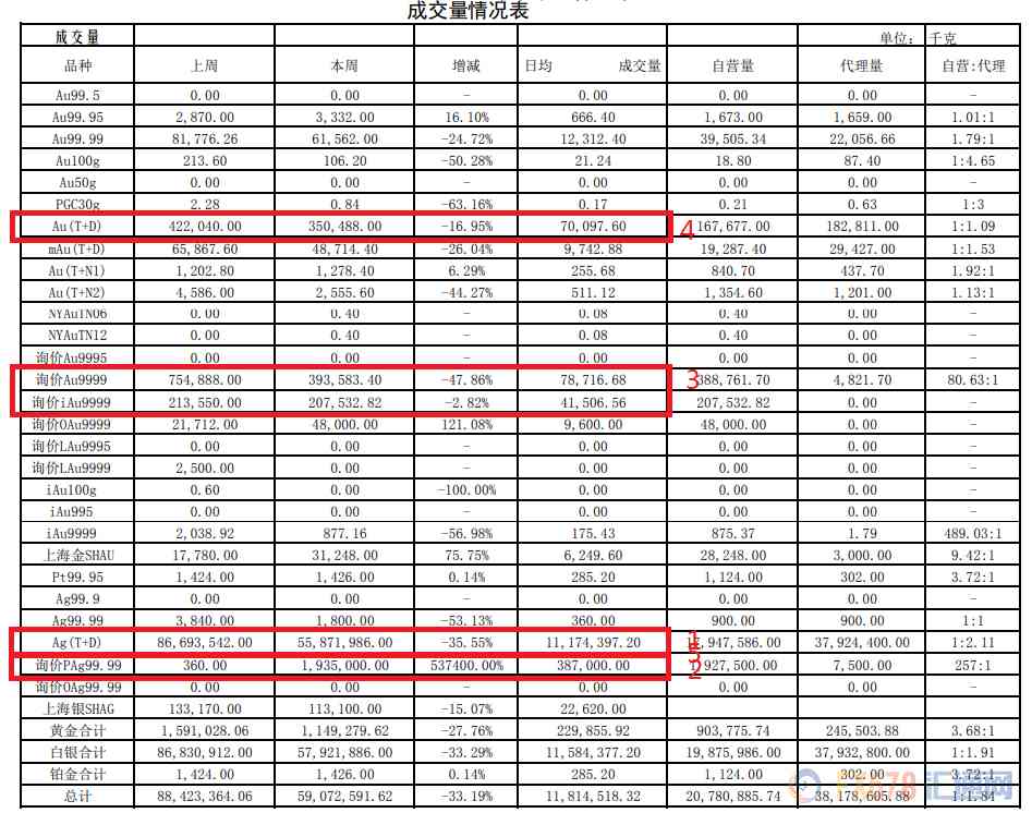 本周三(10月16日)上海黃金交易所公布了第39期行情周報??傮w而言,除了詢價PAg99.99成交量大幅攀升,占據(jù)了成交量榜單第二的位置,貴金屬交易量都出現(xiàn)不同程度的萎縮。和此前多份報告反映的情況一致,黃金交割量仍明顯高于白銀交割量。從各個機構(gòu)表現(xiàn)來看,浦發(fā)銀行不再是最偏好買賣貴金屬的機構(gòu),在自營方面占據(jù)優(yōu)勢的交通銀行拔得頭籌,但是浦發(fā)銀行取代了工商銀行成為上周白銀交易量最大的銀行。