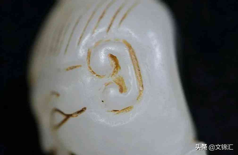 春秋玉人細部圖。玉人耳部用臥蠶紋體現(xiàn),細若發(fā)絲的陰線如同鐵線一般勾勒描繪,底槽利索干凈,砣痕運轉(zhuǎn)處線條變化自然完美銜接。