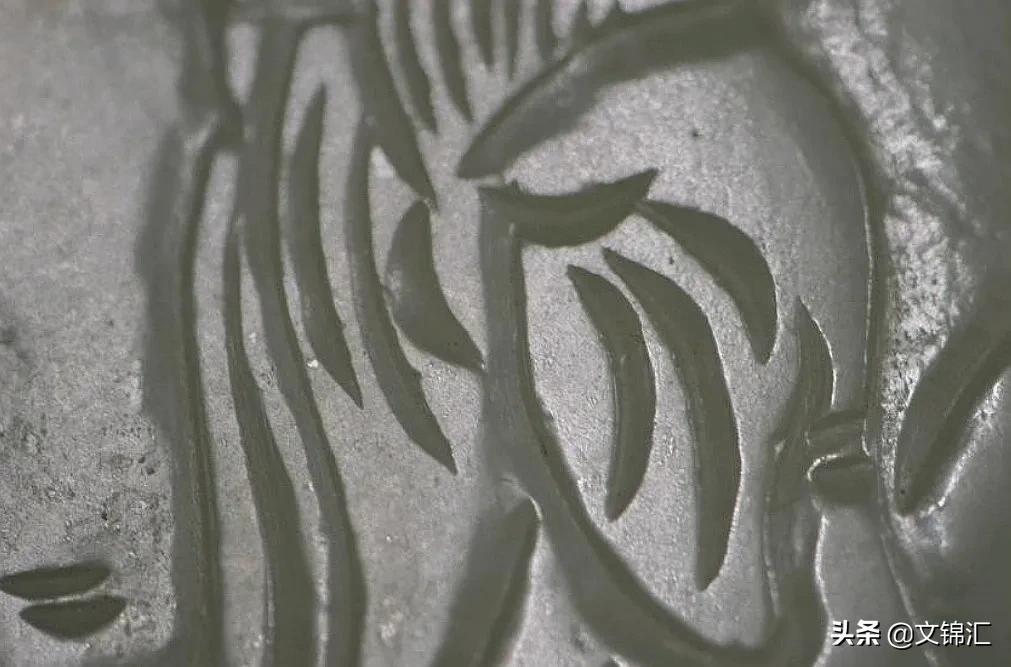 仿唐代陰刻線細部圖。上面的陰刻線是高仿,仔細觀察陰刻線整體生硬,尤其在砣痕的轉(zhuǎn)彎處沒有一氣呵成的流暢感,拘謹做作故意利用斷砣仿作古玉陰刻線的歧線,陰刻線底部也顯慵散沒有自如收砣留下的磨砂痕及V字形底。整體看缺乏一種靈動的藝術(shù)線條和氣息。