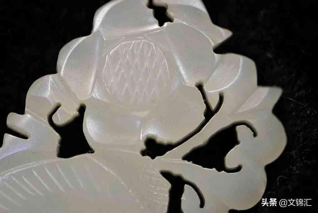 清代花卉玉器細部圖。花瓣全部用砣子挖一凹槽形成,邊緣修飾圓潤,陰線細密排列,鏤空處可看到先以一個圓向另一端延伸偶有以鋸齒狀是拉絲工藝,用桯鉆先打一圓孔然后用鋼絲順著圓孔向前不斷的拉伸,所以會出現(xiàn)這些特征。
