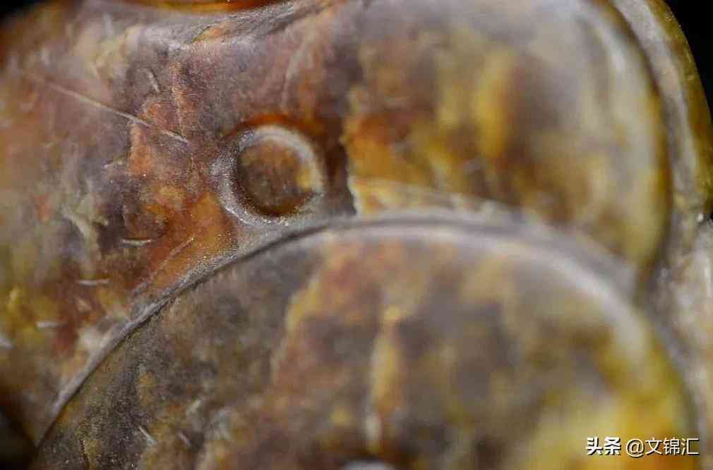 西周璇璣細部圖。這件玉器表皮似果凍狀,如同蒸熟的梨子,由內(nèi)到外可看到變化不同的色澤,布滿整個玉器,這便是所說的包漿。玉器的沁色和白皮交雜著漫布在一起布滿整個玉器,這也是包漿。玉器的沁色和白皮交雜著漫布在一起,并不均勻卻顯得很自然,而且這種質(zhì)變是由里向外的。