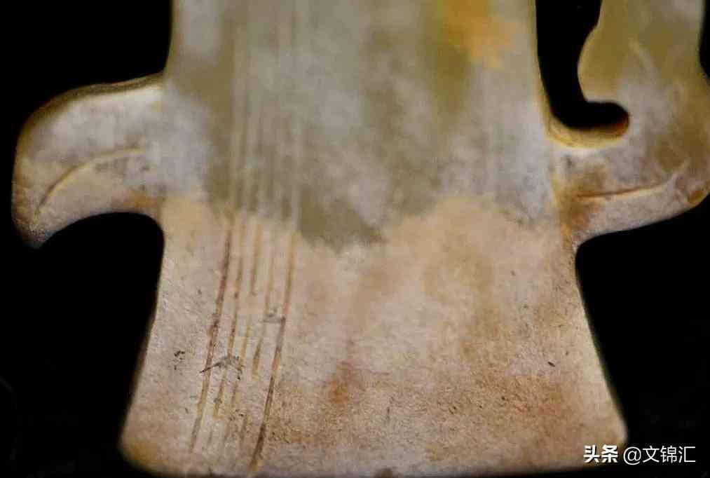 西周玉器細部圖。工痕底槽的包漿與光澤一致,砣痕轉(zhuǎn)接留下的銼刀銜接緊密,和砣具停轉(zhuǎn)所表現(xiàn)出陰線寬窄自然過渡的變化,以及砣具來回轉(zhuǎn)動留下高低不平的磨砂底。