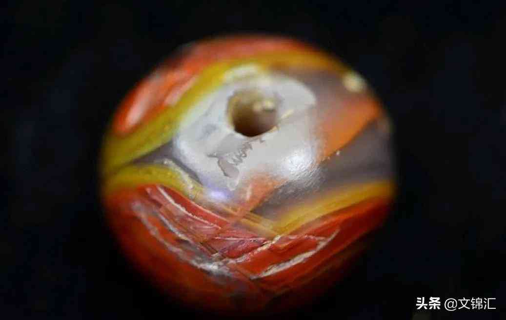 戰(zhàn)國紅縞瑪瑙珠子。此珠子為瑪瑙材質(zhì),色澤艷麗夾雜著紅、黃、白、青幾種顏色,此種材料在春秋戰(zhàn)漢時就有出現(xiàn),古時稱赤玉,開采于遼寧北票。