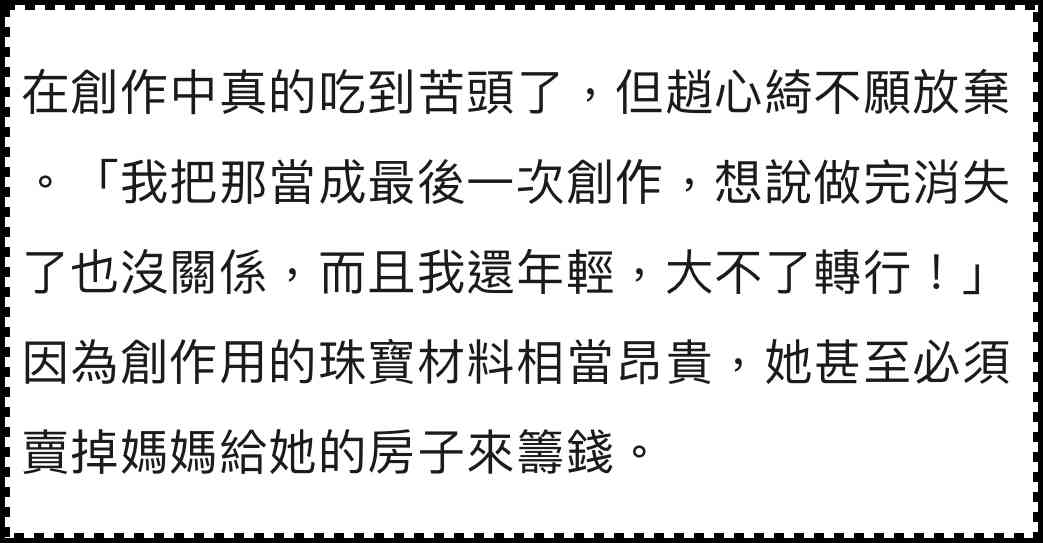 可Cindy Chao卻透露在品牌創(chuàng)立初期,因?yàn)閷毷脙r(jià)和創(chuàng)作難度過(guò)高,一度被迫變賣(mài)母親給的房產(chǎn)來(lái)維持運(yùn)轉(zhuǎn)……
