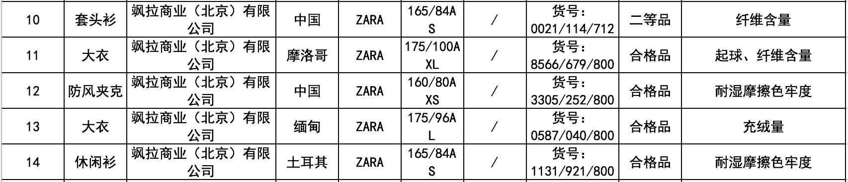 抽查結(jié)果顯示,由颯拉商業(yè)(北京)有限公司生產(chǎn)的5批次ZARA服飾不合格,包括2批次大衣、1批次休閑衫、1批次防風(fēng)夾克和1批次套頭衫,涉及的問題有纖維含量、耐濕摩擦色牢度等。
