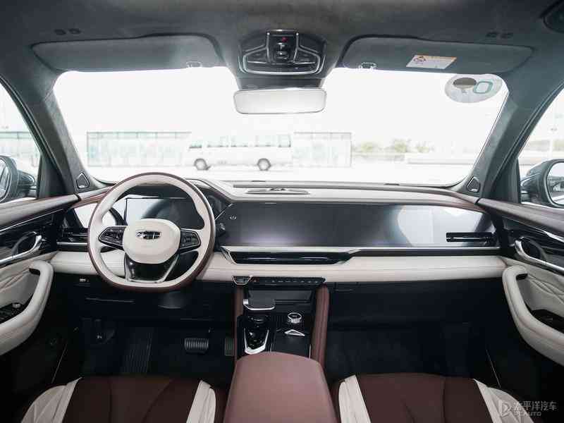 內(nèi)飾上,新車采用了與現(xiàn)有吉利截然不同的設(shè)計(jì)風(fēng)格,全新的長(zhǎng)度約100cm的“貫穿式”中控屏設(shè)計(jì)(中控屏+副駕娛樂屏),進(jìn)一步彰顯了其科技感;而下方電子排擋處似乎借鑒了不少源自領(lǐng)克的菱形元素。同時(shí)中控臺(tái)采用的是雙拼色設(shè)計(jì),相比霸氣的外觀多了一分韻味,整齊的縫線工藝與細(xì)膩的材質(zhì)用料盡顯與眾不同。