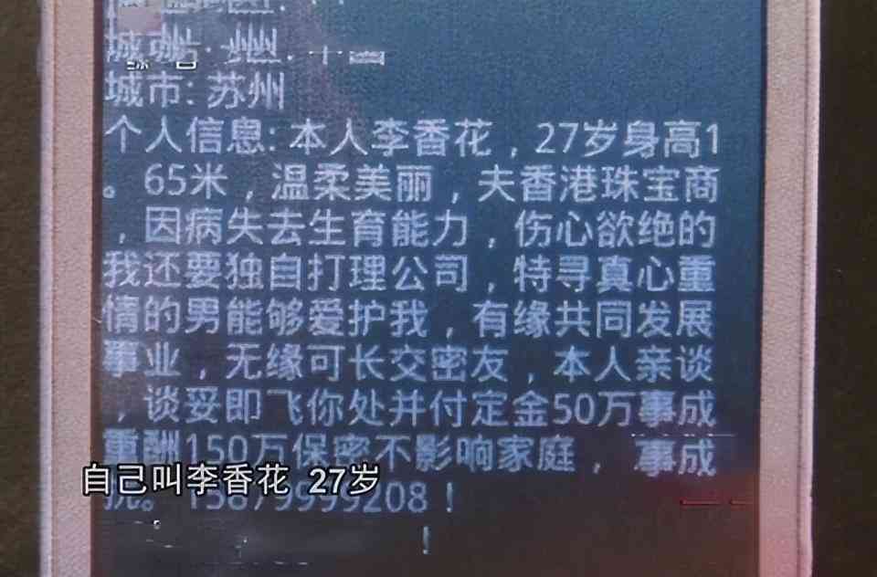 “張悅,30歲。1.65米,丈夫因為愛賭入了獄。丈夫因為在獄中落下病根,不能生育。為救自己的家庭,商議急尋外地陌生男子求孕,若通話談妥速匯訂金50萬,如有孕再重酬150萬?!焙托∷究吹降男V告如出一轍,同樣的文案,同樣的配圖也是年輕靚麗的美女。