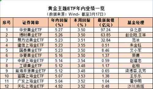 黃金主題ETF方面,wind數(shù)據(jù)顯示,截至3月17日,黃金主題ETF年內(nèi)平均漲幅5.15%。其中,3月13日至3月17日期間漲幅明顯,平均漲幅達(dá)3.51%。