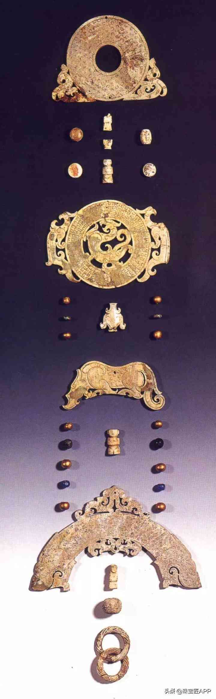 另一種是貴族階層佩戴的組佩,這種組佩不僅單個玉飾精美無比,而且串聯(lián)方式也非同尋常。