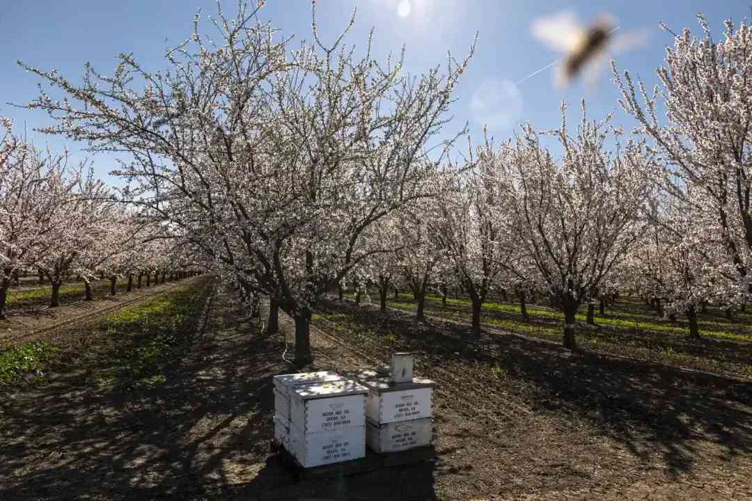 美國幾乎沒有野生蜜蜂,全是職業(yè)養(yǎng)蜂人馴養(yǎng)的歐洲蜜蜂。每年2月,他們把200萬只蜜蜂(占全美商業(yè)蜜蜂的70%)運(yùn)到加利福尼亞的杏園,讓它們授粉傳播。