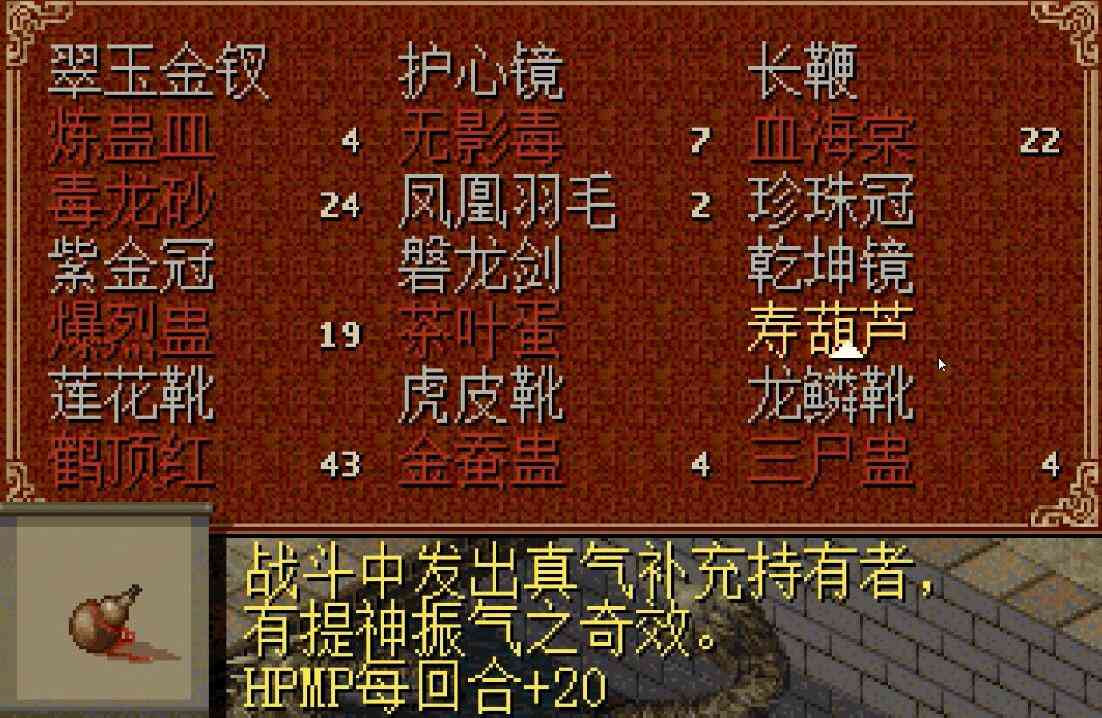 而要是佩戴了壽葫蘆的話(huà),在戰(zhàn)局完成之后會(huì)額外增加20點(diǎn)MP,就依靠這個(gè)MP就能直接選用“酒神咒”,然后讓其他人給李逍遙喂天仙玉露。