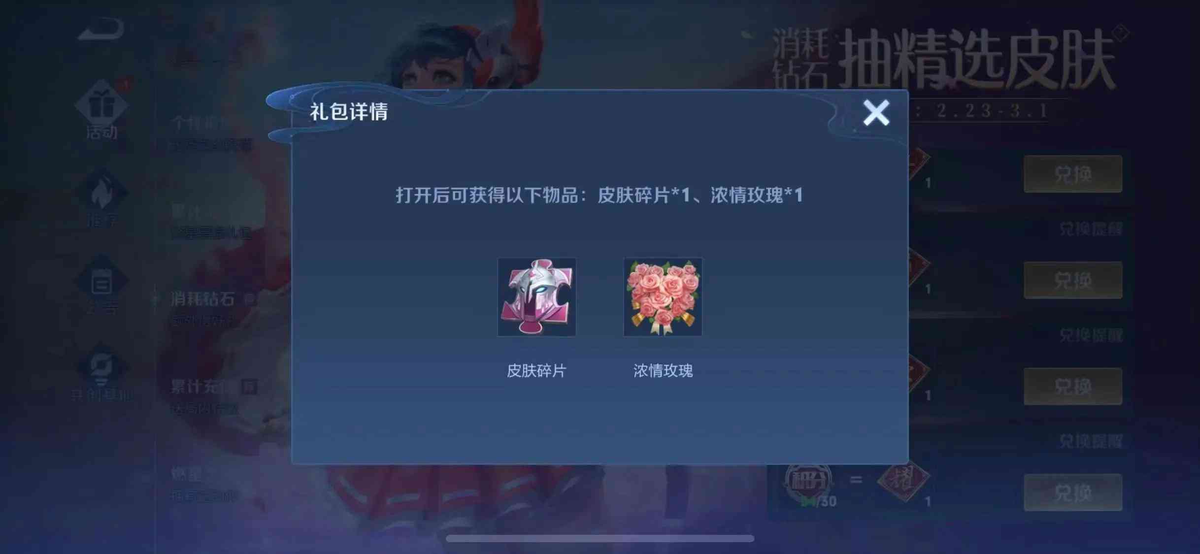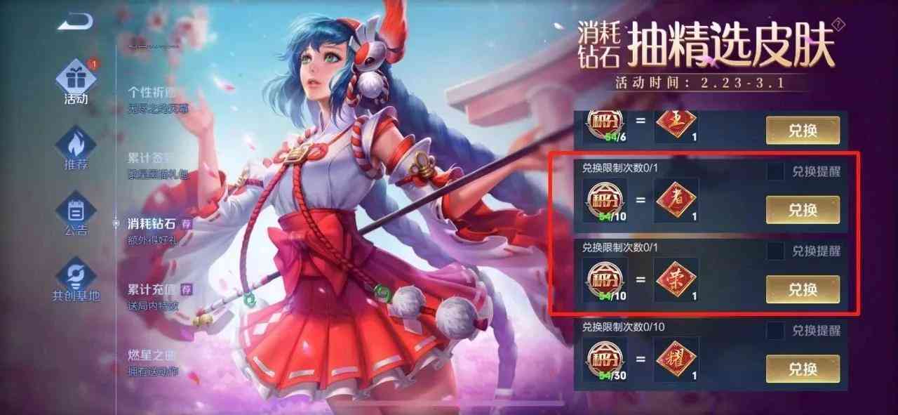 兄弟們直接兌換中間那兩個(gè)“者”和“榮”的獎(jiǎng)勵(lì)即可,里面分別有一個(gè)皮膚碎片。所需積分20點(diǎn),去抽一波鉆石五連抽即可,四舍五入跟一鍵領(lǐng)取沒啥區(qū)別。