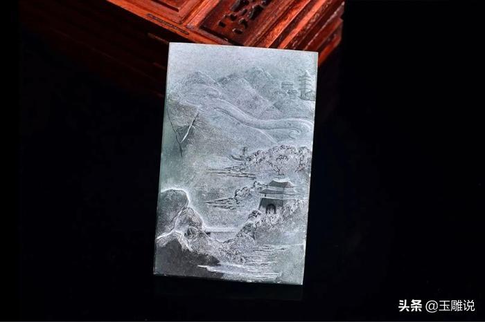 經(jīng)過玉雕師的精心努力雕琢,山水掛件的毛貨總算是完成了。原石上飄著的那些一團團黑黑的色彩,已變成一層層幽綠群山,當(dāng)初那塊不入人們眼球的毛料,此刻已是人人哄搶的翡翠山水方牌。