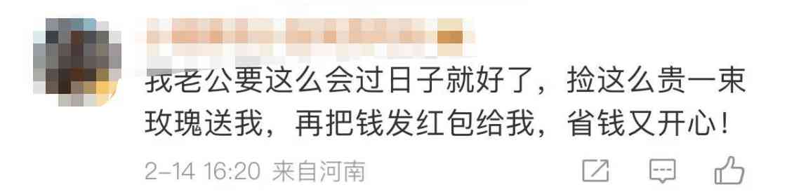 沒(méi)想到的是,網(wǎng)友們的表現(xiàn)也很“反?!?,竟表示非常贊同。一位河南網(wǎng)友就表示,自己老公要是有這么會(huì)過(guò)日子就好了,“撿一束這么貴的玫瑰送給我,再把錢(qián)發(fā)紅包給我,省錢(qián)又開(kāi)心”。