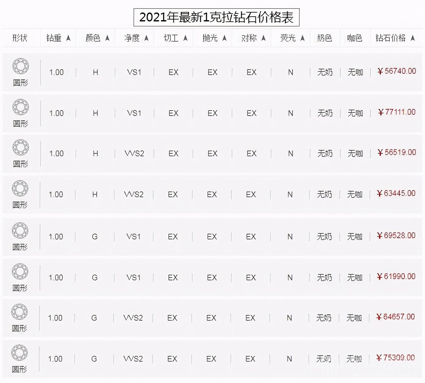 2021年1克拉鉆石價格表