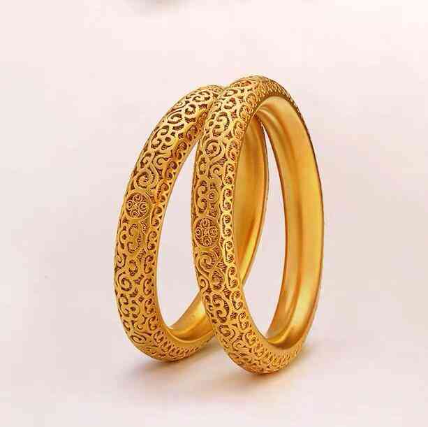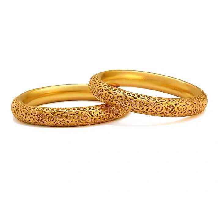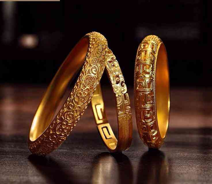 金手環(huán),古稱金壓袖,寓意黃金壓袖口,富貴在家堂,是傳統(tǒng)婚慶三金之一。此件富貴如意手環(huán),為經(jīng)典的貴妃手鐲,為明清宮廷款式,花絲工藝編織祥云紋,精美典雅,高貴靈動,寓意"富貴如意、福運(yùn)綿長"。實心鐲圈,鐲內(nèi)圈打磨成光金面。佩戴舒適。