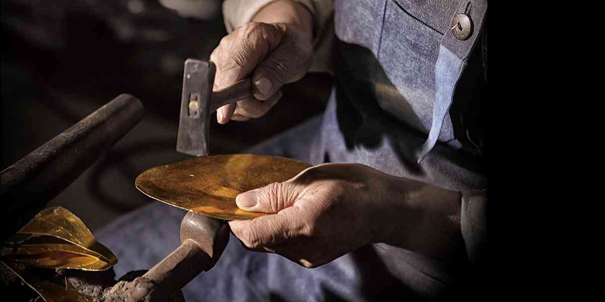 『眼、手、心』配合,全神貫注,用錘具手工敲擊金片成型,敲成形制標(biāo)準(zhǔn),器型規(guī)整,薄厚均勻。