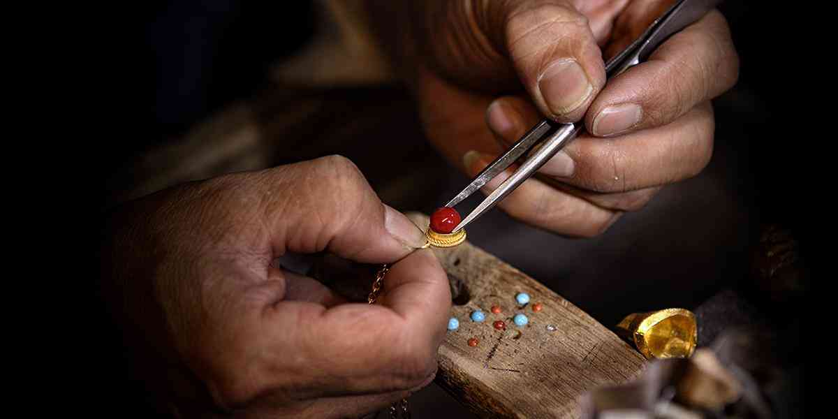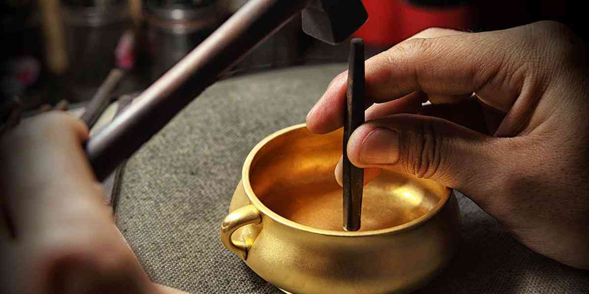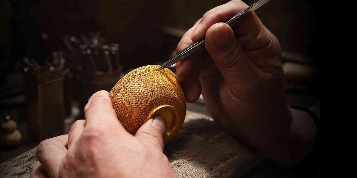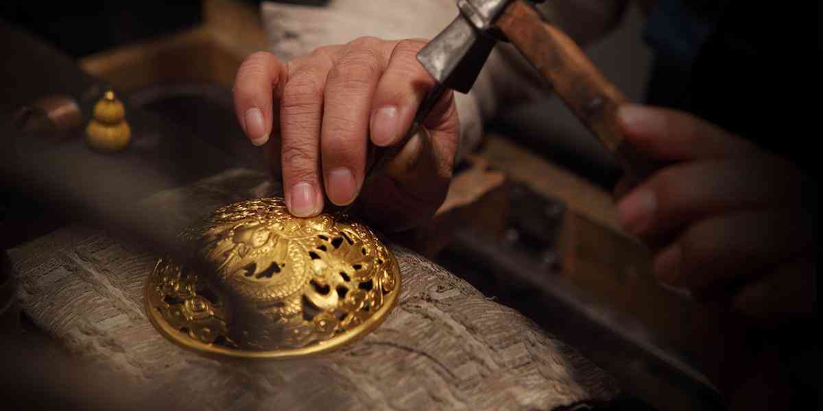 古法手工制金工藝,始于春秋,歷唐宋,興于明清。極具代表的金工藝有:鏤胎、錘揲、 花絲、 鑲嵌、 鏨刻、 修金等,樣樣都是手工傳奇。